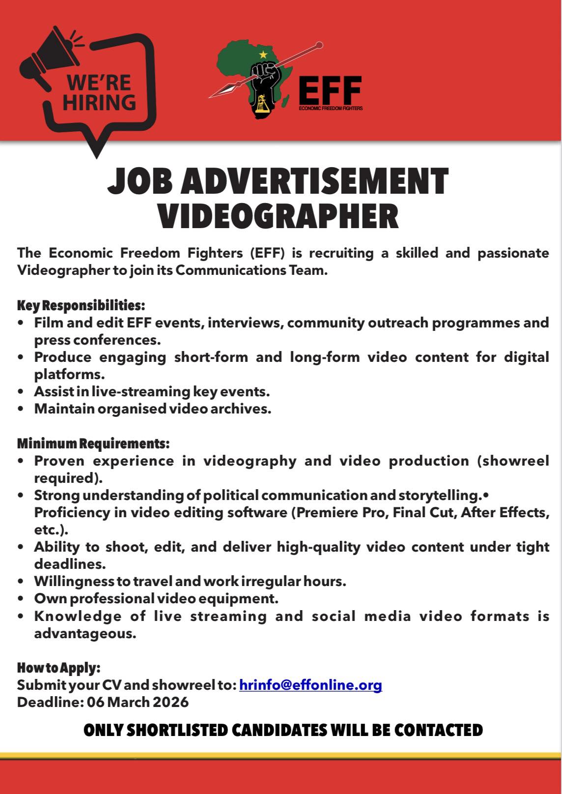 The Economic Freedom Fighters (EFF) is seeking a skilled and driven Videographer to join its Communications Team. In this role, the successful candidate will be responsible for producing high-quality video content that supports organisational campaigns, public engagements, and digital communication strategies aligned with the EFF's political mandate.