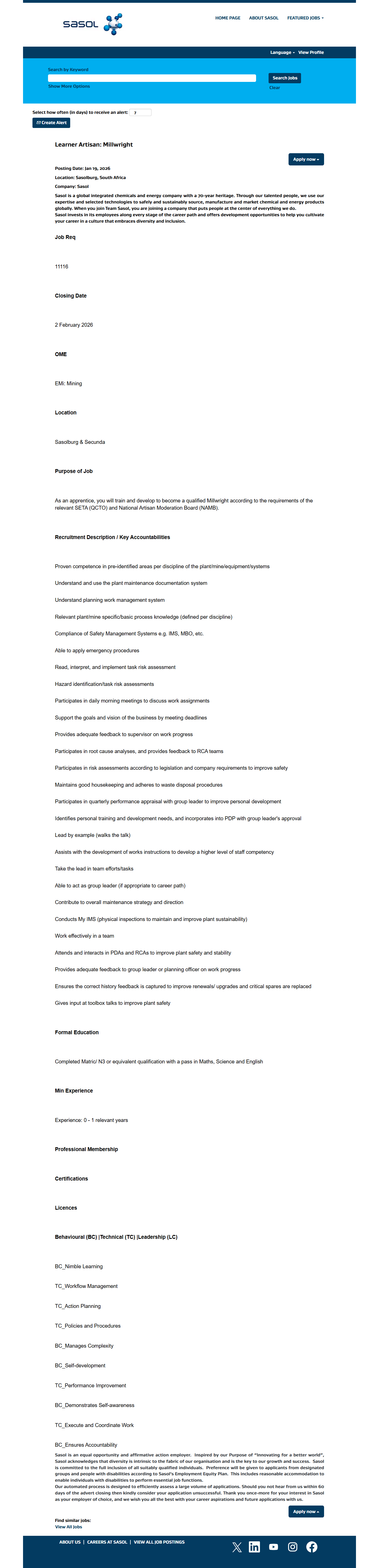 Sasol offers a 4-year Learner Artisan: Millwright apprenticeship combining institutional training with hands-on experience. You'll train to become a qualified Millwright according to SETA (CHIETA/QCTO) and National Artisan Moderation Board (NAMB) requirements, earning a nationally recognized Red Seal qualification.