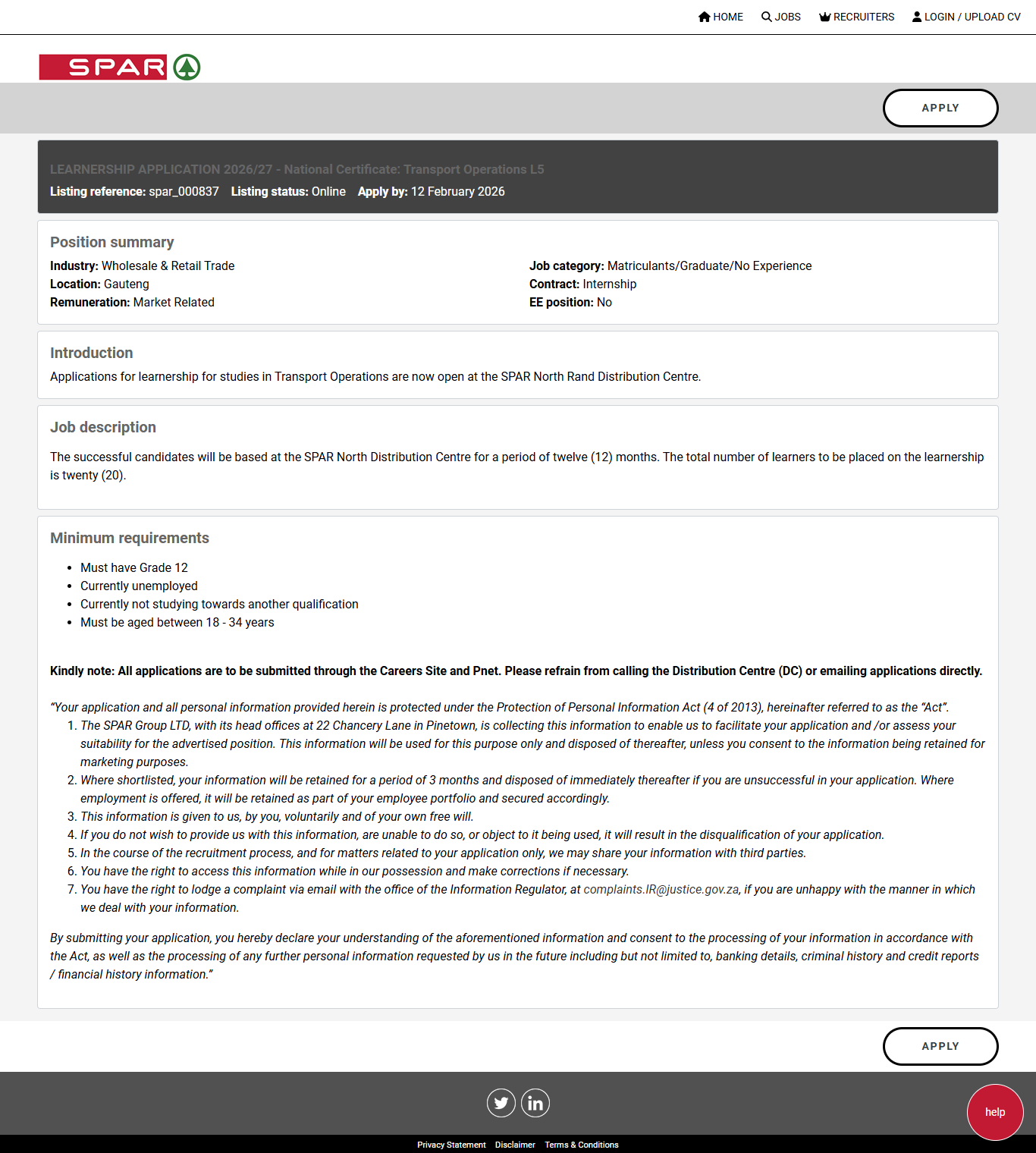 This is a fixed-term learnership programme for skills development purposes and does NOT constitute permanent employment with SPAR. Learners are enrolled for training and workplace exposure only. There is no automatic guarantee of employment upon completion, though exceptional performers may be considered for available permanent vacancies.